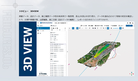 測量データ、設計データ、施工履歴データ等を時系列で一覧管理、表示/非表示を切り替え、データを重ね合わせて現場の状況を確認したり、計測や数量計算、点群編集、施工支援(設計データの編集)、レポート出力を行うことができます。