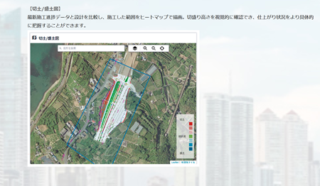最新施工進捗データと設計を比較し、施工した範囲をヒートマップで描画。切盛り高さを視覚的に確認でき、