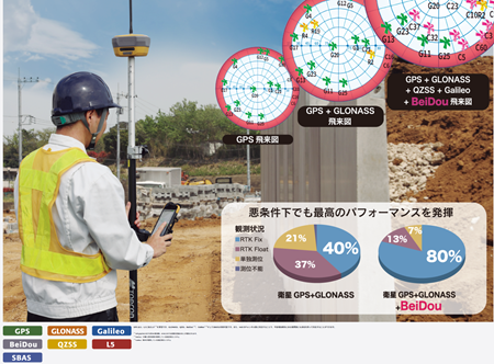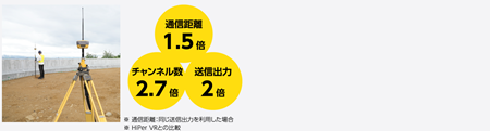 従来機と比較して、通信距離が約1.5 倍に伸長。また1W 出力に対応したことで、より広範囲での通信が可能となりました。また、チャンネル数は従来の30 から82 チャンネルへと大幅に増加し混信の多い工事現場においても安定した通信を実現。さらに、データ転送速度の向上により、GPS・GLONASS・QZSS・BeiDou など受信可能な複数の衛星から取得した高精度なデータをリアルタイムに送受信でき、RTK 観測の安定性と対応エリアが大幅に向上しています。